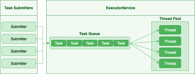 자바 Thread Pool은 작업 처리에 사용되는 Thread를 제한된 개수만큼 정해놓고 작업 큐에 들어오는 작업을 하나씩 Thread가 맡아서 처리한다.